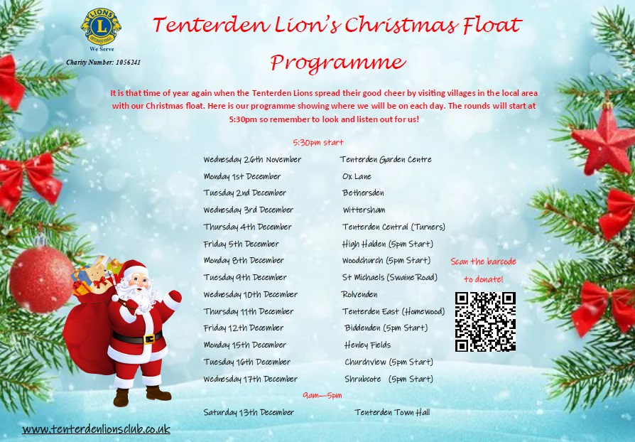 It is that time of year again! Along with Lion members, Santa will be climbing aboard his sleigh to deliver festive cheer to all in Tenterden and the surrounding villages. We will soon be adding a programme so you can see where the float will be on various days leading up to Christmas So Watch This Space